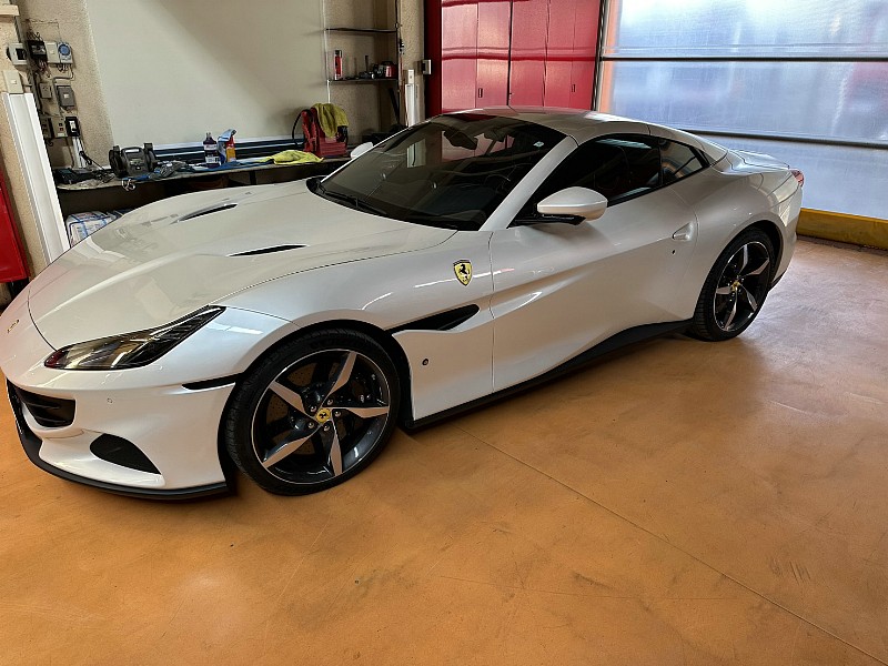上品なホワイトカラーが印象的なフェラーリ ポルトフィーノMが、整備のため入庫いたしました。